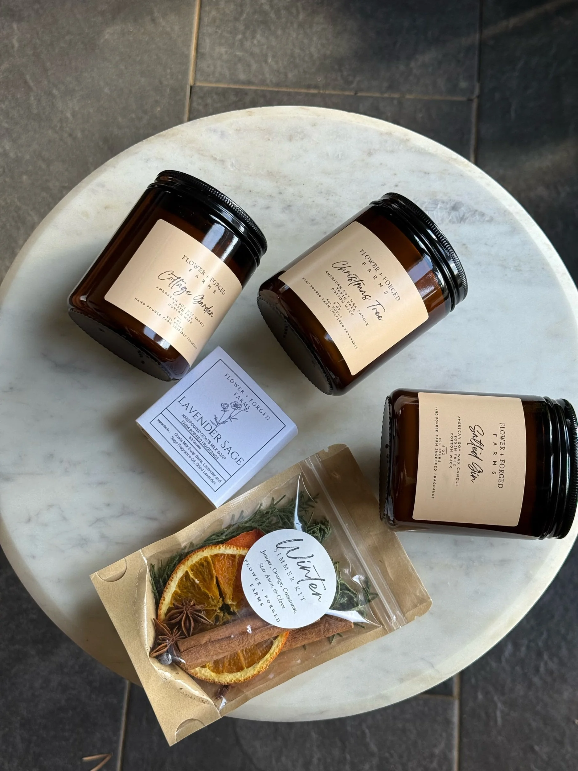Flower and Forged Farms hand poured candles not only are festive but clean for your home. Farm inspired you’ll find scents that bring you back to nature, relaxation, and peace.